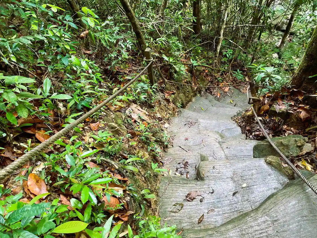 The path down is short but steep, with concrete steps and hand ropes for support. The trail winds through the lush jungle and can be slippery, especially after rain.